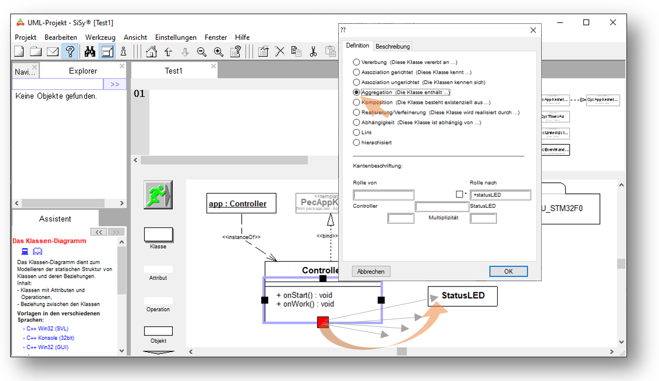Danach verbinden Sie die Klasse Controller mit der Klasse StatusLED und wählen als Verbindungstyp eine Aggregation aus.