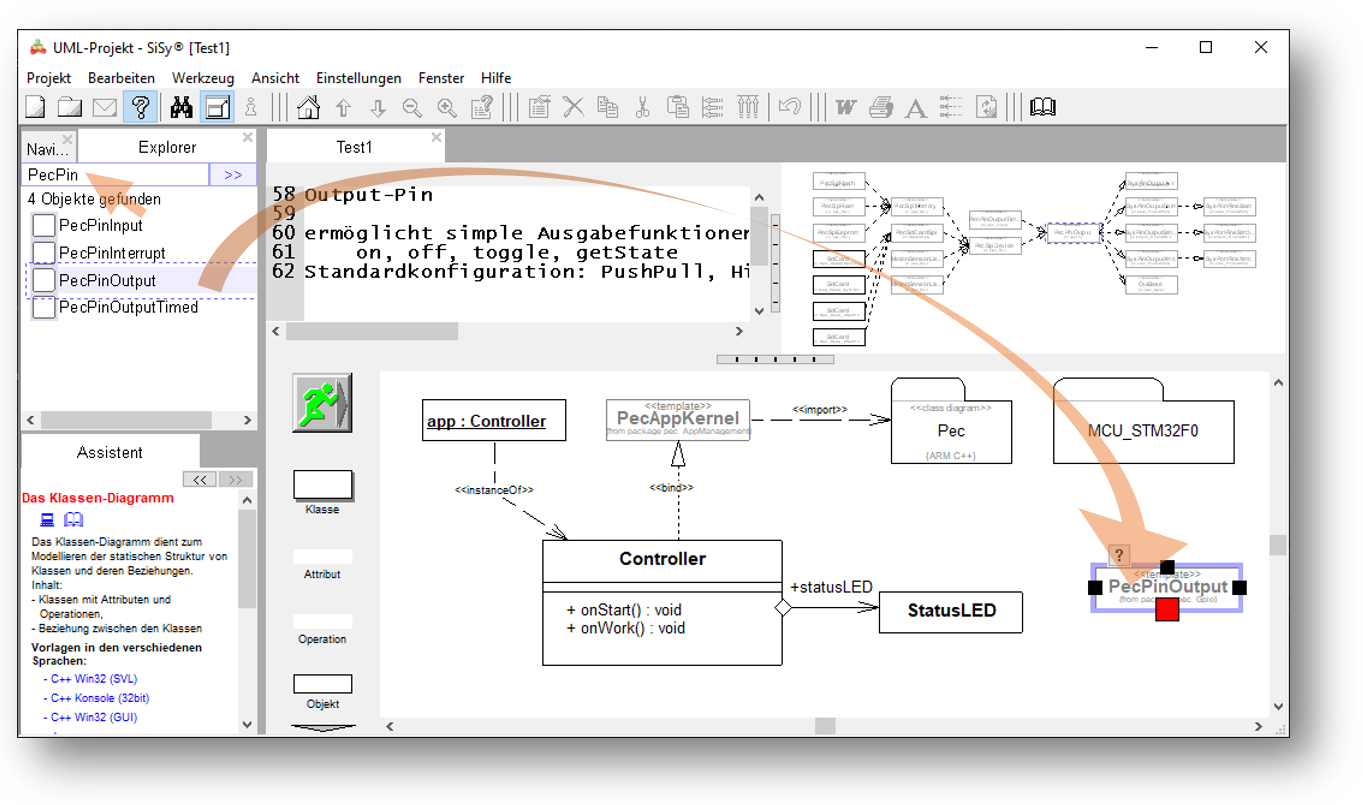 Suchen Sie im Explorer nach dem PEC-Bibliotheksbaustein PecPinOutput. Ziehen Sie dieses Element in das Diagramm.