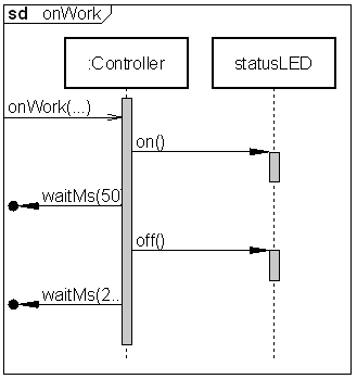 Controller::onWork():void// continuous event from the Mainloop statusLED.on(); waitMs(50); statusLED.off(); waitMs(200);