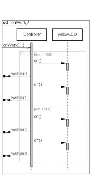 Als nächstes erweitern wir die Anwendung so, dass wir das Ereignis onWork() welches fortlaufend aus der Mainloop der Laufzeitumgebung des Frameworks getriggert wird, benutzen um die gelbe LED ganz schwach glimmen zu lassen (dimmen). Dabei soll das sicht- und hörbare Laufzeitverhalten der anderen Ausgabegeräte nicht beeinflusst werden. Deshalb verwenden wir keine langen Wartefunktionen wie waitMs().