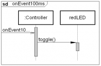Das Ereignis für die 100 Millisekunden wird nicht direkt aus der Interruptfunktion aufgerufen sondern geht den Weg über eine Ereigniswarteschlange (Event Queue). Das bedeutet, dass Ereignisse sich ihrer Reihenfolge nach in der Warteschlange anstellen und wenn das System genug Zeit hat werden diese abgearbeitet. Das führt zwar dazu, dass einige Mikrosekunden Verzögerung (Latenzzeit) zwischen dem Auftreten des Ereignisses und dem Abarbeiten der Ereignisreaktion liegen aber dafür kann das System die dafür aufgewendete Prozessorzeit viel besser managen und das System läuft trotzdem flüssig. Wir erkennen diesen Sachverhalt an dem Bezeichner Event im Ereignisnamen onEvent100ms(). Hier können wir beruhigt eine LED anschließen. Die 100 Millisekunden zwischen jedem Umschalten ergeben 5 Hertz, das nehmen wir locker als blinken wahr.
